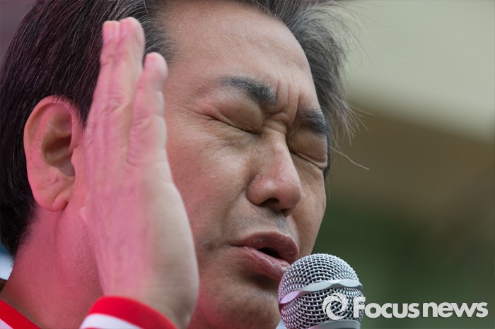 (창원=포커스뉴스) 김무성 새누리당 대표가 4일 오전 경남 창원시 성산구 가음정시장 앞에서 강기윤 창원시성산 후보 지원유세를 하고 있다.