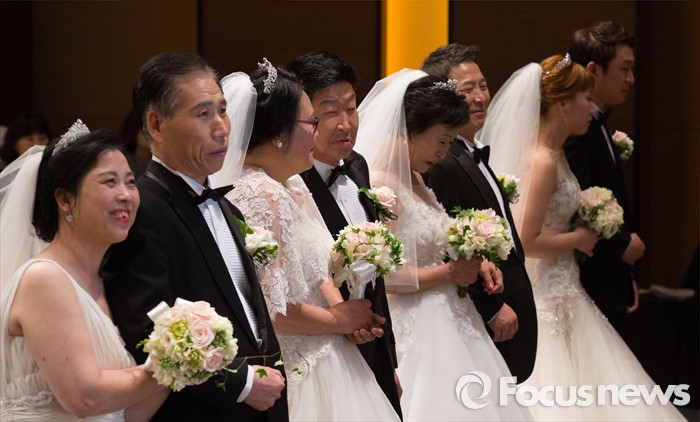 (대전=포커스뉴스) 4일 오전 대전 유성구 호텔ICC에서 열린 제18회 대전장애인자활실천대회 및 합동결혼식에서 신랑과 신부가 주례사를 듣고 있다.