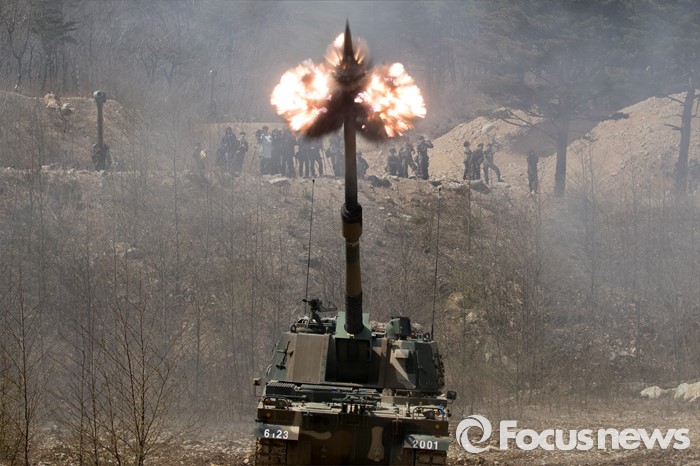 (고성=포커스뉴스) 4일 오전 강원도 고성 야촌리사격장에서 열린 '2016년 전반기 해상사격 훈련'에서 육군 8군단 포병대대 소속 K-9 자주포가 사격을 하고 있다.