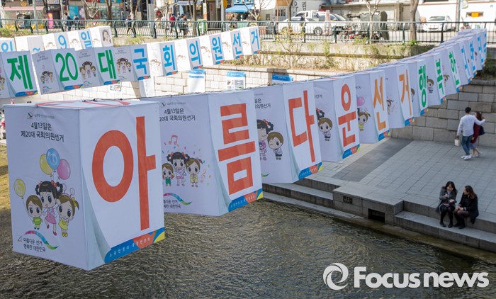 (서울=포커스뉴스) 4일 오후 서울 청계천 모전교에서 광통교 사이에 4.13 제20대 국회의원선거를 알리는 조형물이 설치돼 있다.