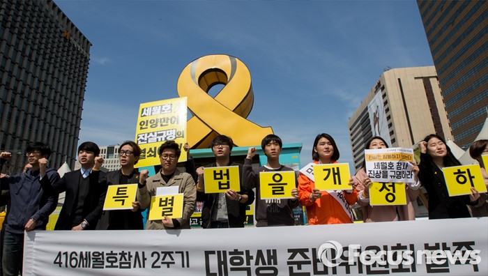 (서울=포커스뉴스) 4일 오후 서울 광화문광장에서 열린 4.16 세월호참사 2주기 대학생 준비위원회 발족식에 참석한 청년들이 특별법 개정을 촉구하는 구호를 외치고 있다.