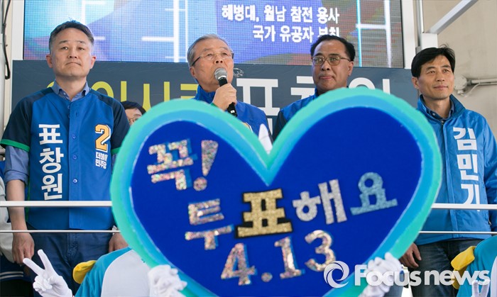 (용인=포커스뉴스) 4일 오후 경기도 이마트 죽전점 앞 광장에서 열린 더불어민주당 용인지역 합동유세에 참석한 김종인 비대위 대표 겸 선대위원장이 인사말을 하고 있다. 왼쪽부터 표창원 용인정 후보, 김 대표, 이우현 용인병, 김민기 용인을 후보.