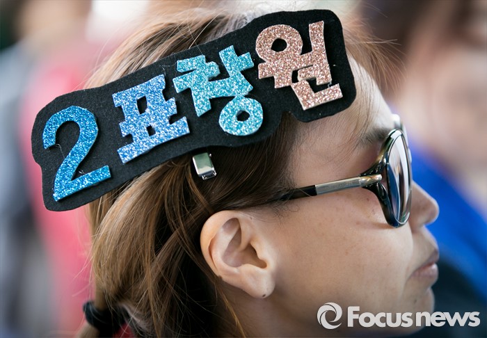 (용인=포커스뉴스) 4일 오후 경기도 이마트 죽전점 앞 광장에서 머리에 장식을 한 선거운동원이 더불어민주당 용인지역 합동유세를 지켜보고 있다.
