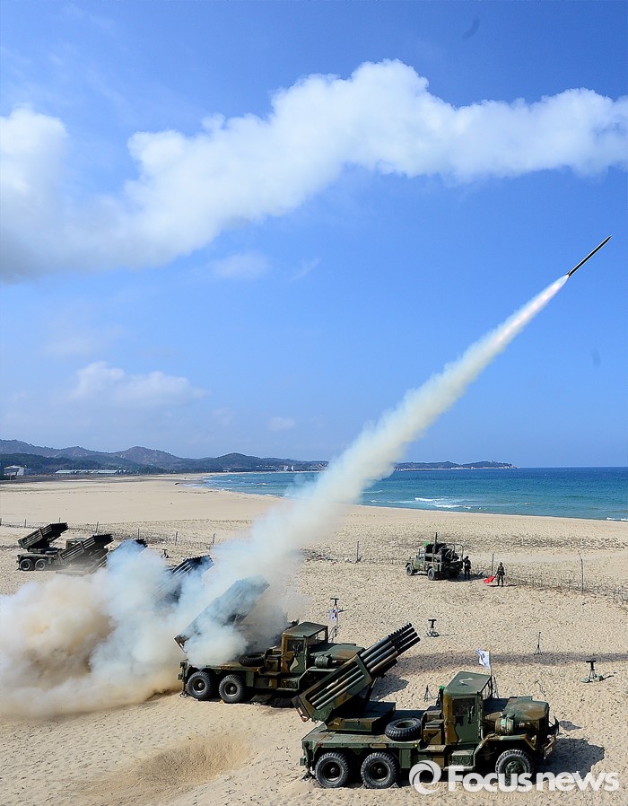 (고성=포커스뉴스) 4일 오후 강원도 고성 송지호해변에서 열린 '2016년 전반기 해상사격 훈련'에서 육군 8군단 포병대대 소속 130mm 다련장 구룡이 로켓탄을 발사하고 있다.