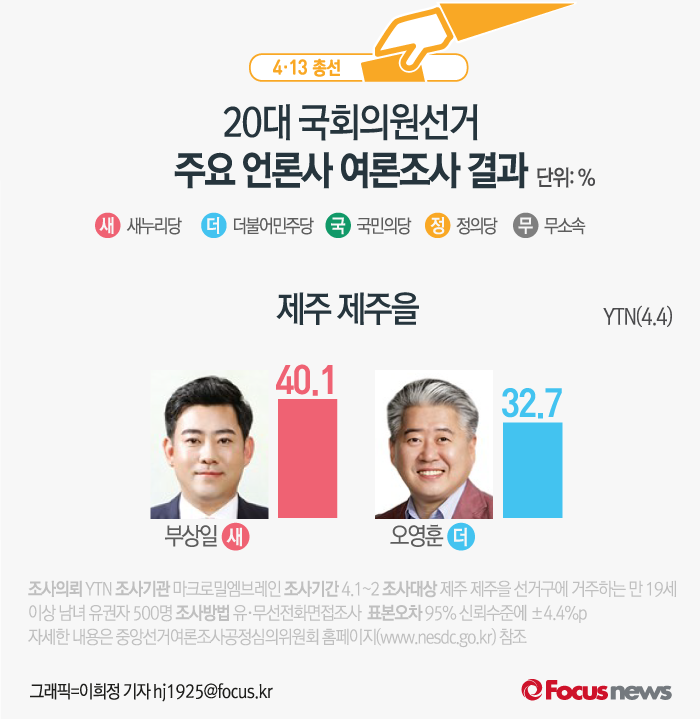 (서울=포커스뉴스) YTN이 마이로밀엠브레인에 의뢰해 4일 발표한 여론조사 결과에 따르면 새누리당 부상일 후보의 지지율은 40.1%, 더불어민주당 오영훈 후보의 지지율은 32.7%를 기록했다.