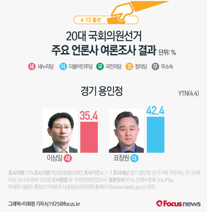 (서울=포커스뉴스) YTN이 마이로밀엠브레인에 의뢰해 4일 발표한 여론조사 결과에 따르면 새누리당 이상일 후보의 지지율은 35.4%, 더불어민주당 표창원 후보의 지지율은 42.4%를 기록했다.