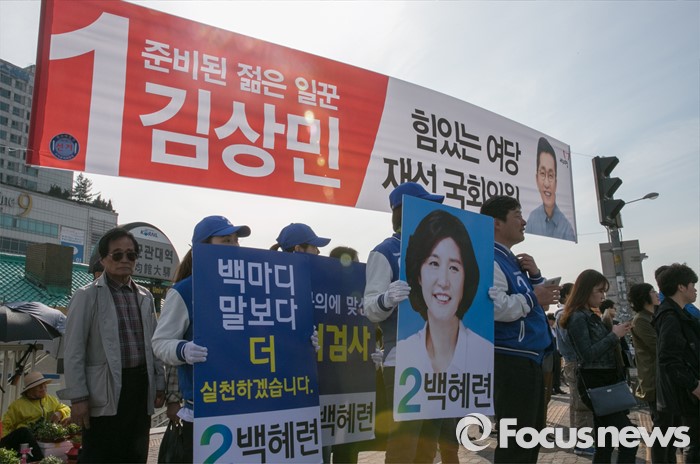(수원=포커스뉴스) 4일 오후 경기도 지하철 1호선 성균관대역 앞에서 김상민 새누리당 경기 수원을 후보의 현수막 아래 백혜련 더불어민주당 경기 수원을 후보의 선거운동원들이 지지를 호소하고 있다.