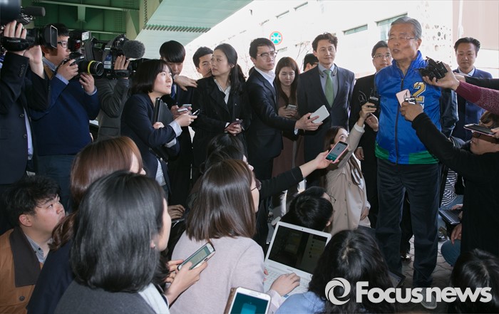 | △ 취재진 질문 답하는 김종인 |