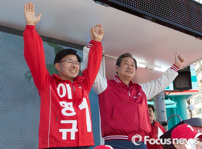 (대전=포커스뉴스) 김무성 새누리당 대표 최고위원이 5일 오전 대전 서구 한민시장 일원에서 이영규 후보의 지지를 호소하고 있다.