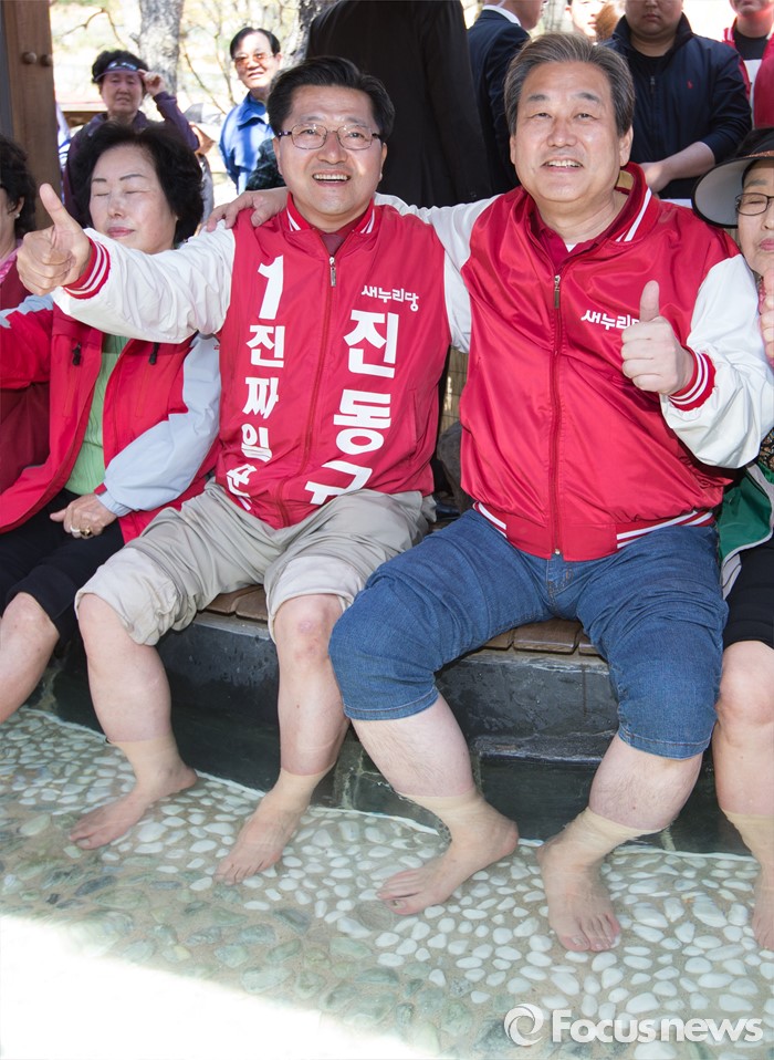 (대전=포커스뉴스) 김무성 새누리당 대표가 5일 오전 대전 유성구 족욕체험장에서 족욕을 하며 진동규 후보의 지지를 호소하고 있다.