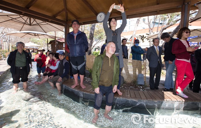 (대전=포커스뉴스) 5일 오전 대전 유성구 족욕체험장 일원 시민들이 족욕체험을 하며 김무성 새누리당 대표의 유세를 바라보고 있다.