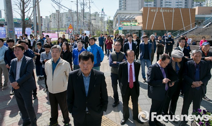 (아산=포커스뉴스) 5일 오전 충남 아산시 배방읍사무소 앞 사거리에서 시민 및 지지자들이 김종인 더불어민주당 비대위 대표 겸 선대위원장과 강훈식 아산을 후보의 선거유세를 지켜보고 있다.