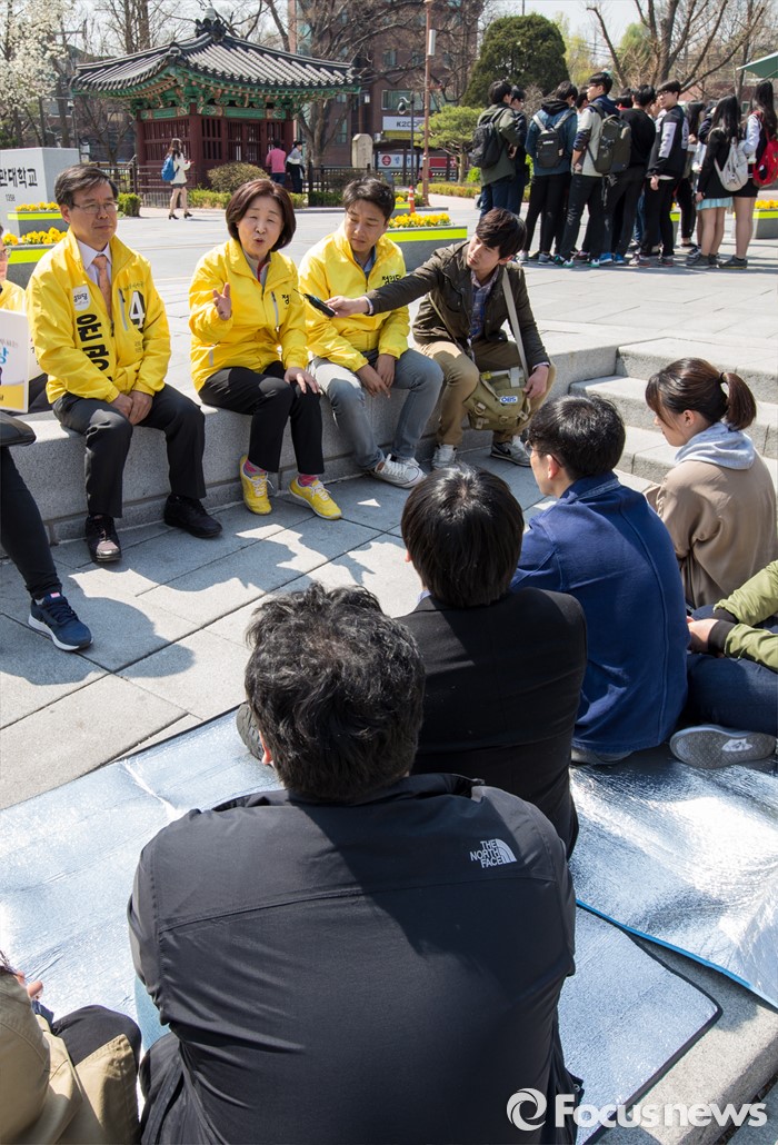 (서울=포커스뉴스) 5일 오전 서울 종로구 성균관대학교 정문 앞에서 윤공규 종로구 후보 지원유세에 나선 심상정 정의당 상임선거대책위원장이 대학생들과 간담회를 하고 있다.