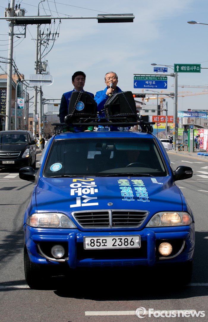 (아산=포커스뉴스) 5일 오전 충남 아산시 배방읍사무소 앞 인근 거리에서 김종인(오른쪽) 더불어민주당 비대위 대표 겸 선대위원장과 강훈식 아산을 후보가 유세를 마친 뒤 차량에 올라 지지를 호소하고 있다.