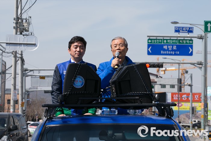 | △ 유세차량 타고 지지 호소하는 김종인-강훈식 |