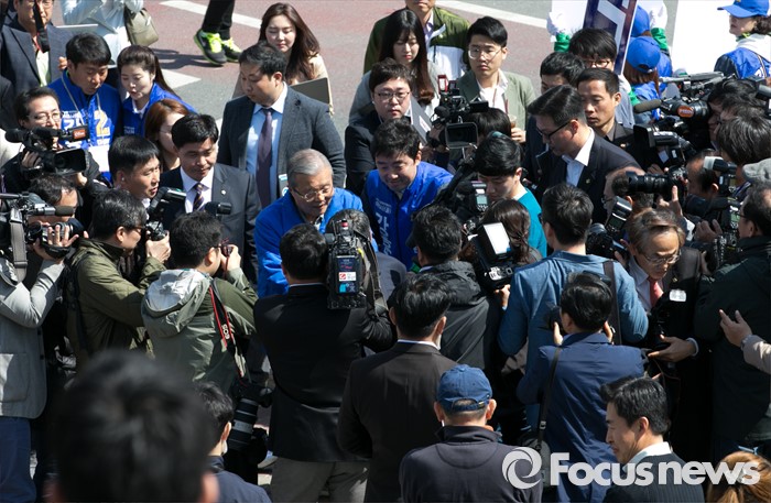 (아산=포커스뉴스) 5일 오전 충남 아산시 배방읍사무소 앞 사거리에서 김종인(왼쪽) 더불어민주당 비대위 대표 겸 선대위원장과 강훈식 아산을 후보가 유세를 마친 뒤 시민 및 지지자들과 인사하며 지지를 호소하고 있다.