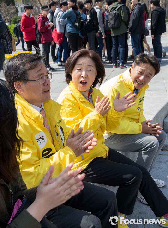(서울=포커스뉴스) 5일 오전 서울 종로구 성균관대학교 정문 앞에서 윤공규 종로구 후보 지원유세에 나선 심상정(가운데) 정의당 상임선거대책위원장, 조성주(오른쪽) 비례후보가 윤 후보에게 박수를 보내고 있다.