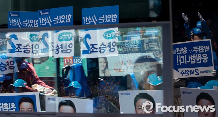 (천안=포커스뉴스) 5일 오전 충남 천안시 신세계백화점 앞에서 열린 더불어민주당 천안지역 합동유세에 참여한 선거운동원들이 지지를 호소하고 있다.