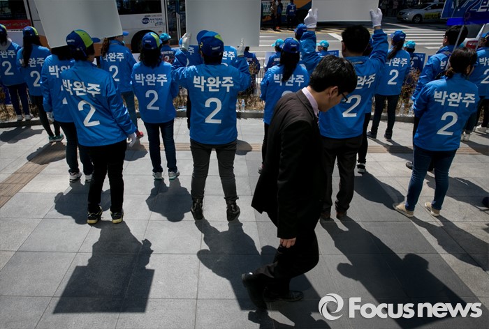 (천안=포커스뉴스) 5일 오전 충남 천안시 신세계백화점 앞에서 열린 더불어민주당 천안지역 합동유세에 참여한 선거운동원들이 지지를 호소하고 있다.