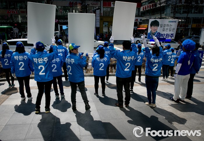 (천안=포커스뉴스) 5일 오전 충남 천안시 신세계백화점 앞에서 열린 더불어민주당 천안지역 합동유세에 참여한 선거운동원들이 지지를 호소하고 있다.