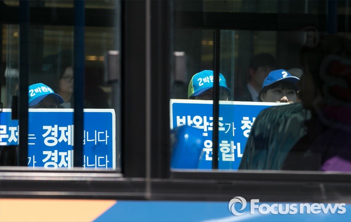 (천안=포커스뉴스) 5일 오전 충남 천안시 신세계백화점 앞에서 열린 더불어민주당 천안지역 합동유세에 참여한 선거운동원들이 지지를 호소하고 있다.