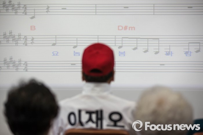(서울=포커스뉴스) 은평을 무소속 이재오 후보가 5일 오전 서울 은평구 불광노인복지관을 찾아 어르신들과 함께 노래교실에서 수업을 듣고 있다.