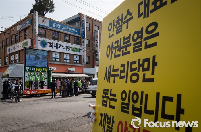 (의정부=포커스뉴스) 안철수 국민의당 상임공동대표가 5일 오후 의정부시 태평로 제일시장 앞에서 김경호 의정부갑 후보 지원유세를 하고있는 가운데 한 야권통합 지지론자가 1인 시위를 하고 있다.