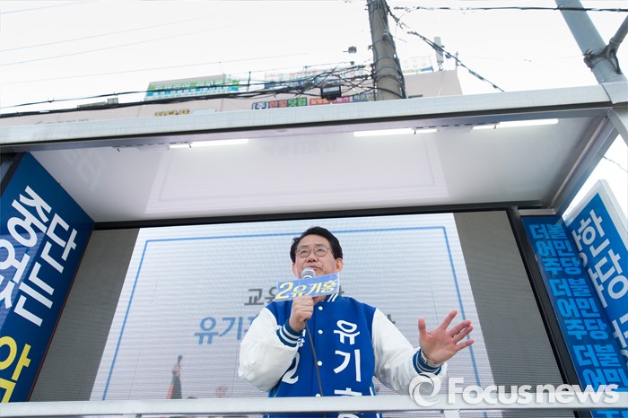(서울=포커스뉴스) 5일 오후 서울 관악구 서울대입구역 인근에서 유기홍 더불어민주당 관악구갑 후보가 선거유세를 하고 있다.