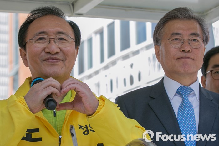 (창원=포커스뉴스) 문재인(오른쪽) 전 더불어민주당 대표가 5일 오후 경남 창원시 성산구 반송시장 앞에서 노회찬 정의당 창원성산 후보 지원유세에 참석해, 노 후보와 함께 서 있다. 노 후보는 창원성산에서 허성무 더불어민주당 후보와 경합에서 승리해, 더민주 · 정의당 단일후보로 출마한다.