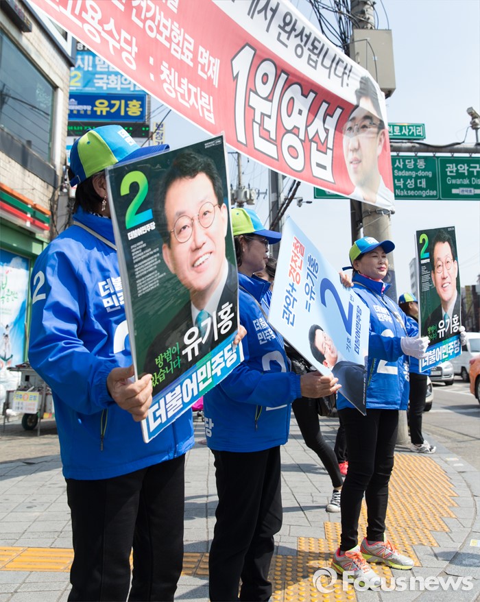 (서울=포커스뉴스) 5일 오후 서울 관악구 서울대입구역 인근에서 유기홍 더불어민주당 관악구갑 후보 선거운동원들이 지지를 호소하고 있다.