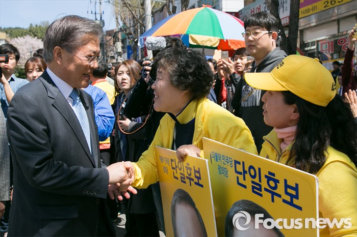 (창원=포커스뉴스) 문재인(왼쪽) 전 더불어민주당 대표가 5일 오후 경남 창원시 성산구 반송시장에서 노회찬 정의당 창원성산 후보 지원유세에 참석해, 노 후보 선거운동원과 인사하고 있다. 노 후보는 창원성산에서 허성무 더불어민주당 후보와 경합에서 승리해, 더민주 · 정의당 단일후보로 출마한다.