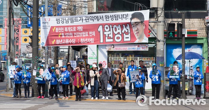 (서울=포커스뉴스) 5일 오후 서울 관악구 서울대입구역 인근에서 유기홍 더불어민주당 관악구갑 후보 선거운동원들이 지지를 호소하고 있다.