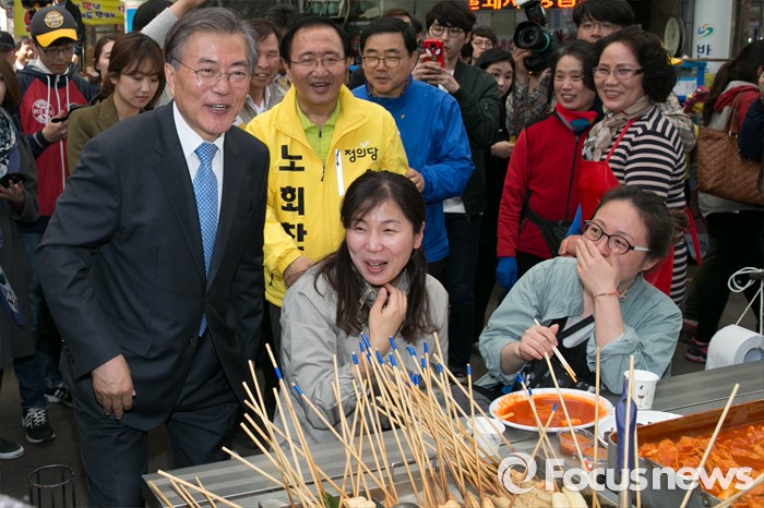 (창원=포커스뉴스) 문재인(왼쪽) 전 더불어민주당 대표가 5일 오후 경남 창원시 성산구 반송시장에서 노회찬(왼쪽 두번째) 정의당 창원성산 후보 지원유세를 하고 있다. 노 후보는 창원성산에서 허성무(왼쪽 세번째) 더불어민주당 후보와 경합에서 승리해, 더민주 · 정의당 단일후보로 출마한다.