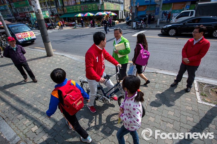 (서울=포커스뉴스) 정두언 새누리당 서대문을 후보와 홍성덕 국민의당 서대문을 후보가 5일 오후 서울 서대문구 백련시장 일대에서 선거운동을 하던 중 대화를 나누고 있다.