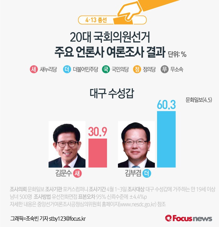 (서울=포커스뉴스) 문화일보가 여론조사기관 포커스컴퍼니에 의뢰해 5일 발표한 결과에 따르면 더민주 김부겸 후보가 60.3%, 새누리당 김문수 후보가 30.9%의 지지율을 보이는 것으로 조사됐다.
