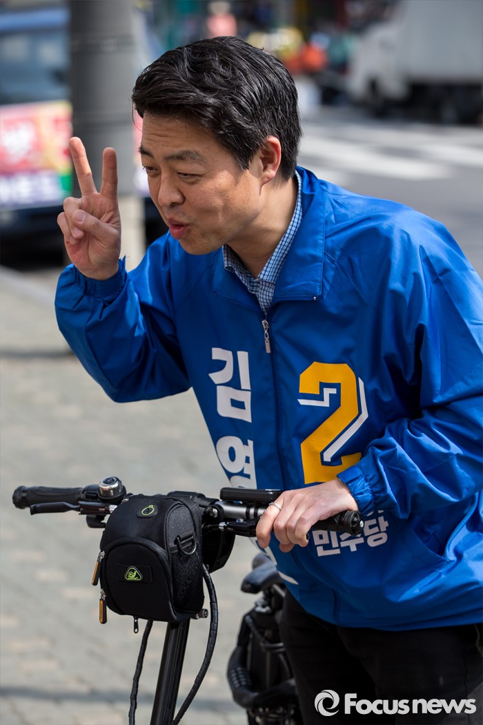 (서울=포커스뉴스) 김영호 더불어민주당 서대문을 후보가 5일 오후 서울 서대문구 백련시장 일대에서 자전거를 타고 주민들을 만나며 한 표를 호소 하고 있다.