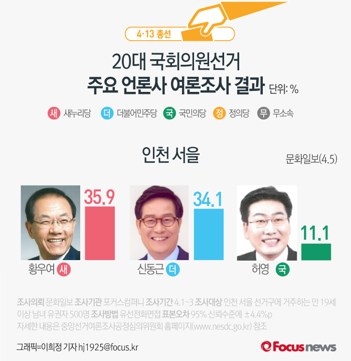 (서울=포커스뉴스) 문화일보가 포커스컴퍼니에 의뢰해 5일 발표한 여론조사 결과에 따르면 새누리당 황우여 후보의 지지율은 35.9%, 더불어민주당 신동근 후보의 지지율은 34.1%, 국민의당 허영 후보는 11.1%를 기록했다.