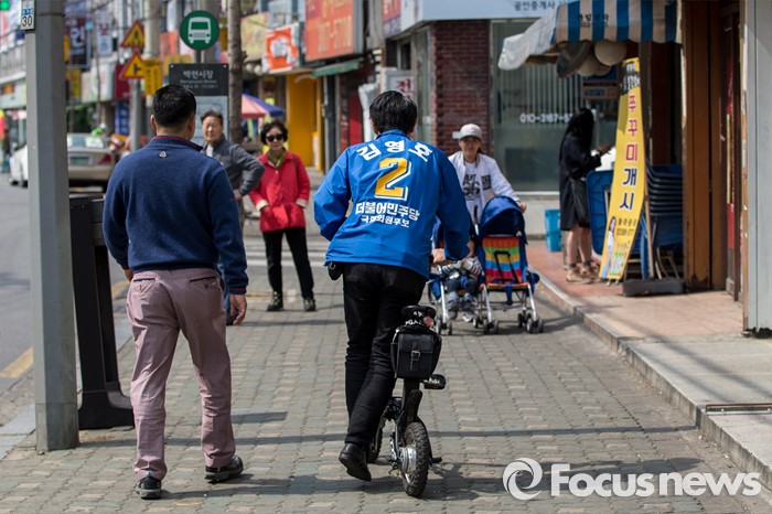 (서울=포커스뉴스) 김영호 더불어민주당 서대문을 후보가 5일 오후 서울 서대문구 백련시장 일대에서 자전거를 타고 주민들을 만나며 한 표를 호소 하고 있다.