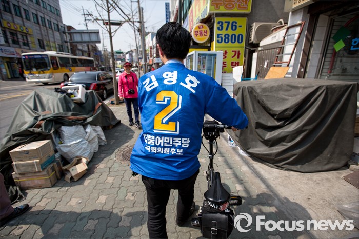 (서울=포커스뉴스) 김영호 더불어민주당 서대문을 후보가 5일 오후 서울 서대문구 백련시장 일대에서 자전거를 타고 주민들을 만나며 한 표를 호소 하고 있다.