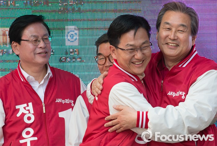 (청주=포커스뉴스) 김무성 새누리당 대표가 5일 오후 충북 청주 성안길에서 오성균 후보와 포옹을 하고 있다.