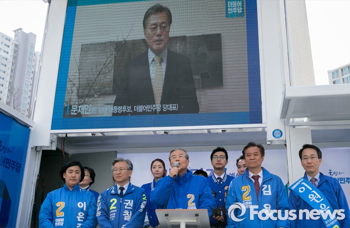 | △ 문재인 영상 아래 지지 호소하는 김종인 |