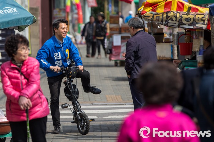 (서울=포커스뉴스) 김영호 더불어민주당 서대문을 후보가 5일 오후 서울 서대문구 백련시장 일대에서 자전거를 타고 주민들을 만나며 한 표를 호소 하고 있다.