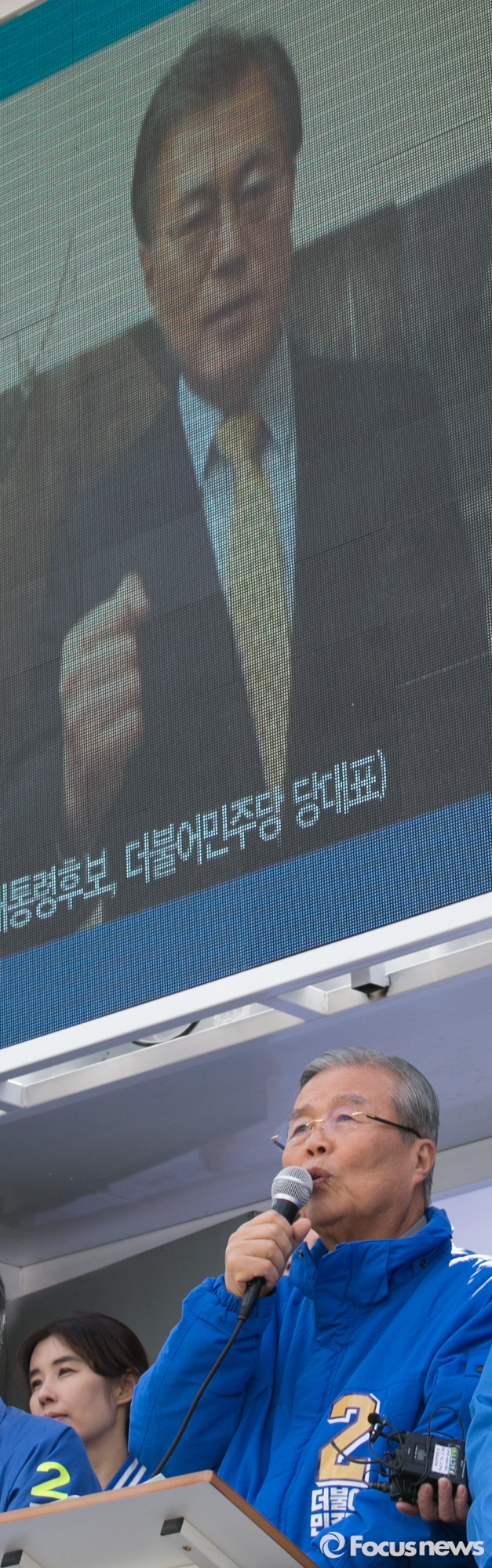 (화성=포커스뉴스) 5일 오후 경기도 화성 봉담읍 하나로마트 앞에서 열린 더불어민주당 화성지역 합동유세에 참석한 김종인 비대위 대표 겸 선대위원장이 문재인 전 대표의 홍보영상 아래 지지를 호소하고 있다.