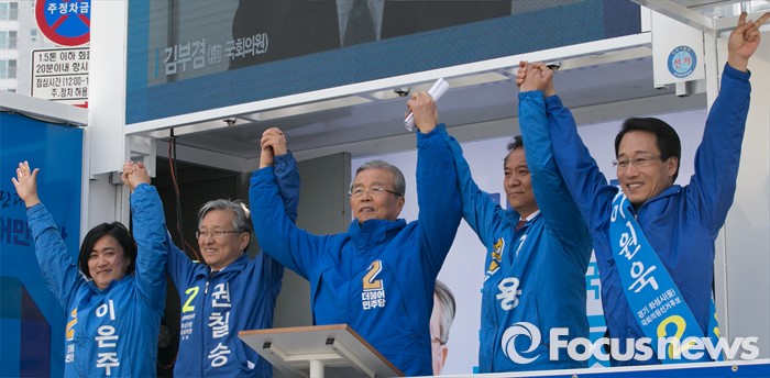 (화성=포커스뉴스) 5일 오후 경기도 화성 봉담읍 하나로마트 앞에서 열린 더불어민주당 화성지역 합동유세에 참석한 김종인 비대위 대표 겸 선대위원장과 화성 후보들이 손을 들어 취재진을 향해 포즈를 취하고 있다. 왼쪽부터 이은주 도의원 후보, 권칠승 화성병 후보, 김 대표, 김용 화성갑, 이원욱 화성을 후보.