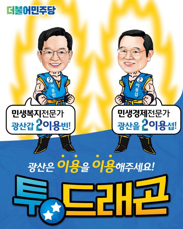 이어 두 후보는 "광산 '투 드래곤 이용빈(광산갑)·이용섭(광산을)'이 광산구 전역을 아우르는 복지와 경제정책 연대를 통해 ‘행복한 복지 광산·든든한 경제 광산'을 만들어 내겠다"며 "광산구 지역민들께서 누가 지역민들 곁에 있어야 든든하겠는가를 잘 판단해 줄 것으로 믿는다"고 목소리를 높였다.20대 총선에서 광주 광산갑과 광산을에 출마하는 이용빈 후보와 이용섭 후보 <사진출처=이용섭 후보 페이스북>
