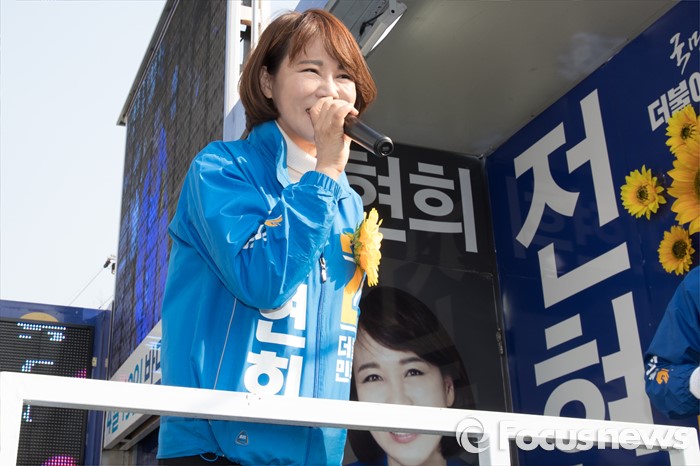 (서울=포커스뉴스) 20대 총선에 출마한 전현희 더불어민주당 강남을 후보가 5일 오후 서울 수서역 인근에서 유권자들에게 지지를 호소하고 있다.