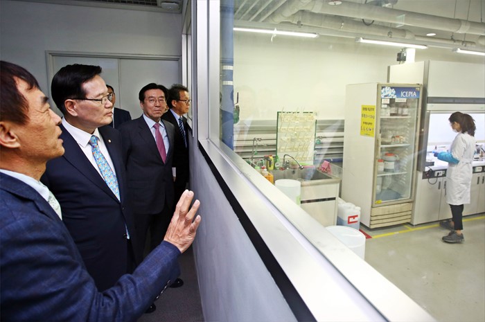 (서울=포커스뉴스) 정의화 국회의장이 5일 오전 경기도 성남 분당구 IT소재 전문기업인 솔브레인을 방문해 산업현장을 둘러보고 있다. <사진제공=국회>