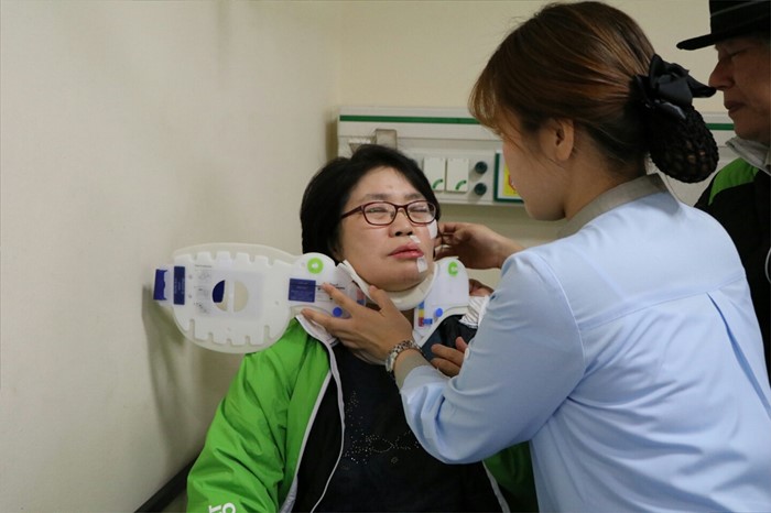 (서울=포커스뉴스) 안귀옥 국민의당 인천 남구을 후보가 5일 오전 새벽 예배를 마친 뒤 선거유세를 위해 이동 중 신원이 밝혀지지 않은 괴한에게 습격을 당했다고 캠프 관계자가 전했다. 사진은 사건 직후 인근 종합병원 응급실에서 치료 중인 안 후보의 모습. <사진제공=안귀옥 후보 선거사무소>