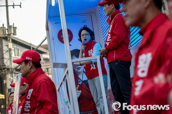 (서울=포커스뉴스) 황춘자 새누리당 용산구 후보가 5일 오후 서울 용산구 이태원동 일대에서 유세를하며 주민들에게 한 표를 호소 하고 있다.