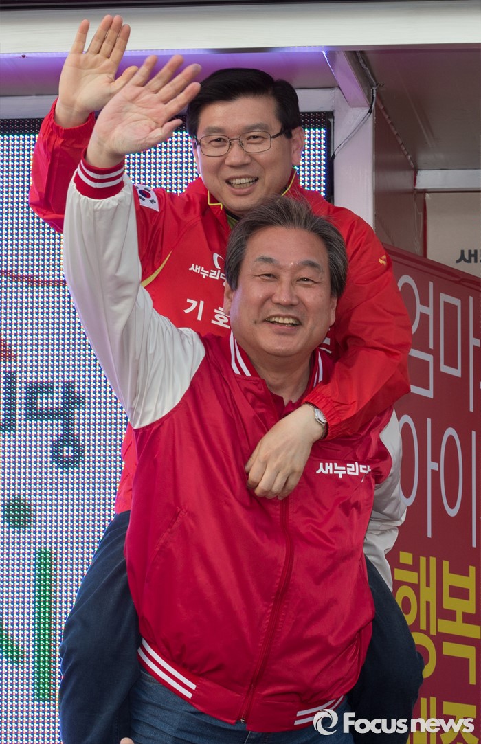 (세종=포커스뉴스) 김무성 새누리당 대표가 5일 오후 세종시 조치원읍 조치원역 앞 교차로에서 박종준 후보를 등에 업고 지지를 호소하고 있다.